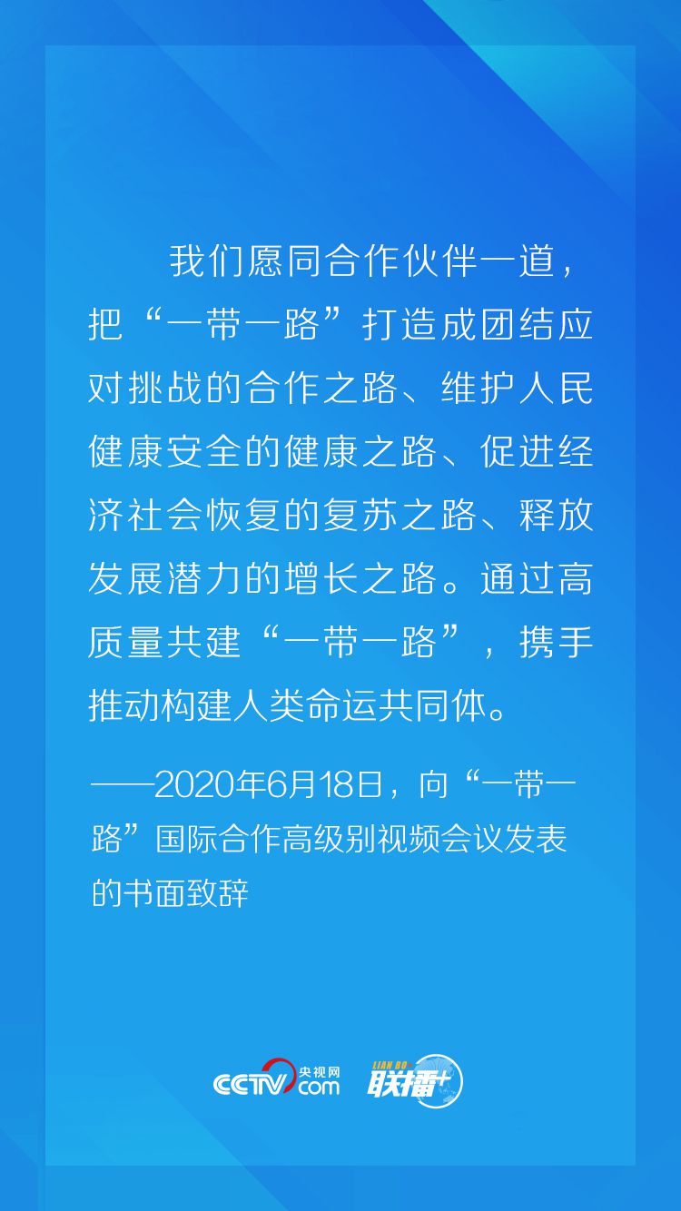 联播+“无论是应对疫情,还是恢复经济,都要走团结合作之路,都应坚持多边主义。促进互联互通、坚持开放包容,是应对全球性危机和实现长远发展的必由之路,共建‘一带一路’国际合作可以发挥重要作用。”