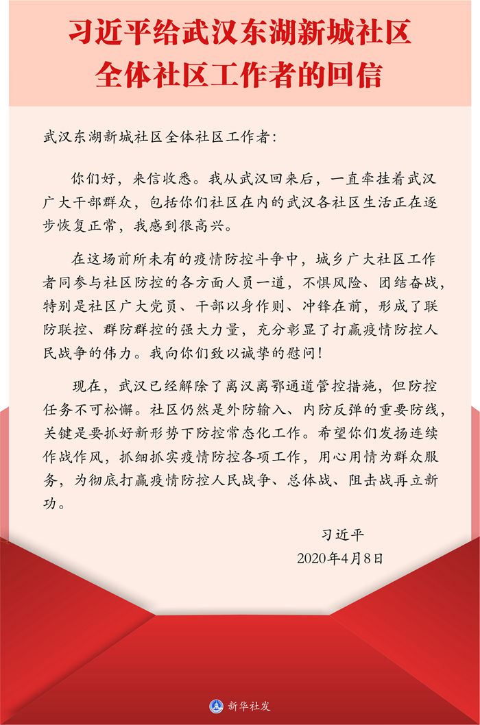 中共中央总书记、国家主席、中央军委主席习近平4月8日给武汉市东湖新城社区全体社区工作者回信,再次肯定城乡广大社区工作者在疫情防控斗争中发挥的重要作用,向他们致以诚挚的慰问,并勉励他们为彻底打赢疫情防控人民战争、总体战、阻击战再立新功。