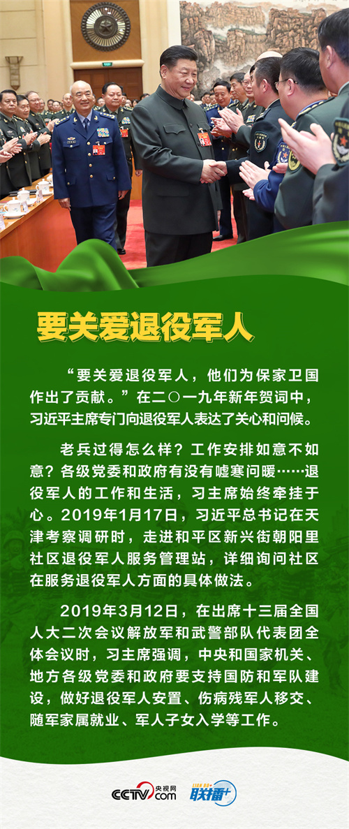 退役与现役是军人人生的不同阶段,无论是穿着军装为国家保驾护航,还是脱下军装为梦想打拼,都值得全社会尊崇!央视网《联播+》特推出海报,为您讲述习主席与退役军人之间的温暖故事。