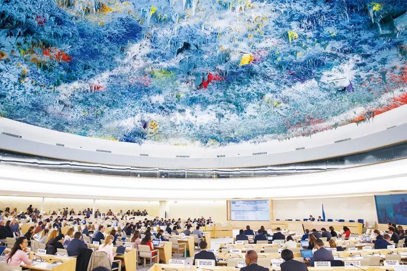 构建人类命运共同体被写入联合国社会发展委员会、安理会、人权理事会以及联合国大会裁军与国际安全委员会等机构的多项决议中,有力推动这一理念变成全球性共识。图为2017年3月20日,中国代表在联合国人权理事会第三十四次会议上代表发展中国家发言。3天后,人权理事会通过决议,明确表示要“构建人类命运共同体”。 新华社记者 徐金泉/摄