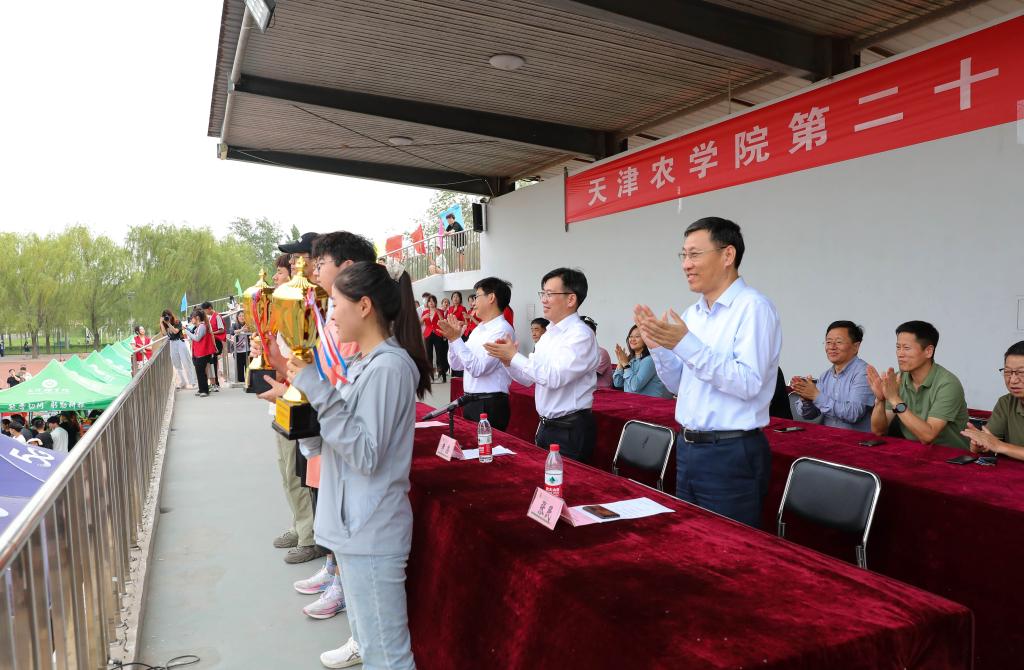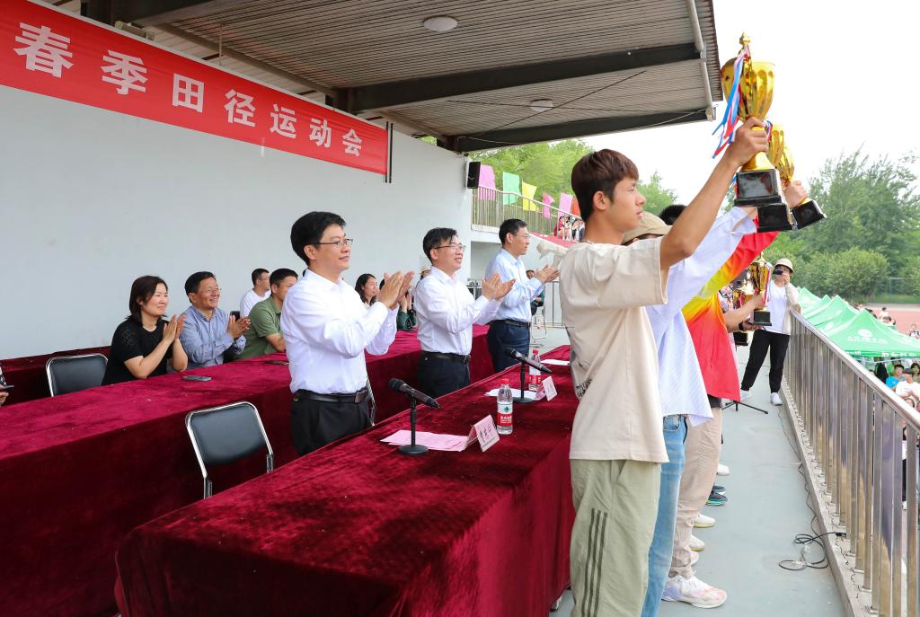 校领导为获得团体总分前六名、体育道德风尚先进集体的学院颁奖。