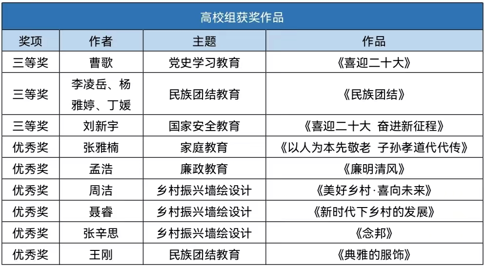 为做好此次大赛的组织参赛工作,校党委高度重视,党委学工部牵头组织各学院师生开展作品设计、遴选、申报工作,涵盖党史学习教育、国家安全教育、乡村振兴墙绘设计等13个类别,充分展示了天农大学生的良好精神风貌和优秀人文素养。