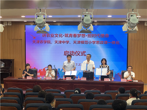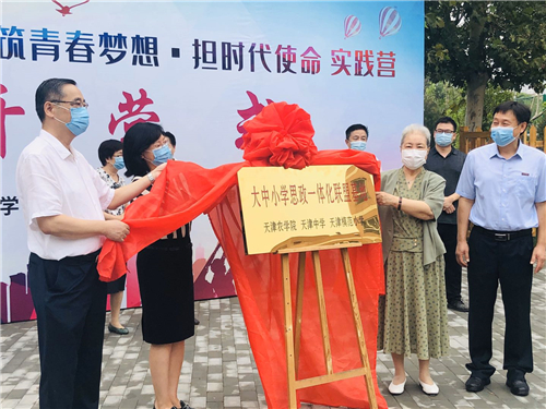 为深入贯彻习近平总书记在全国思想政治理论课教师座谈会上的重要讲话精神,落实中央和市委关于推进大中小学思政课一体化建设、推动思政课建设内涵式发展的工作部署和要求,我校积极与天津中学、天津模范小学开展多次交流、考察,商研后,于7月27日,在天津中学举行了三校思政课一体化建设签约揭牌仪式暨首场实践活动。市关工委常务副主任、市委原常委、市委组织部原部长邢军,天津市教育系统关工委常务副主任陆丽琴,市关工委教卫体部部长、国家督学王洪华莅临指导。我校党委副书记宋涛,天津中学党委书记王慧、校长孙建昆,天津模范小学理事长邹绍宁、校长刘绍萍等出席活动。