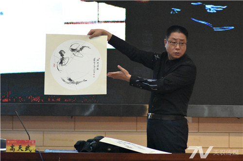 高天武从什么是中国画讲起,从中国画的起源、分类,到作画的笔法、墨法、色法技巧,从工笔花鸟到泼墨写意等娓娓道来,介绍了我国历史上著名书画名家及其代表作品。高天武现场展示了其作品,并与现场学生进行了积极互动。