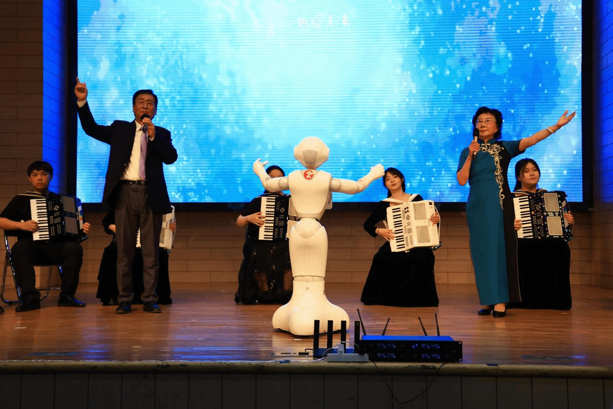 整场演出以三大亮点打造“新质朗诵”:AI实时生成适配音乐,赋予经典诗文科技生命力;机器人与老教授跨时空对诵,构建未来感艺术场景;老教授与青年团队代际共创,推动传统朗诵与AI科技交融。演出以天津音乐学院朱经白教授为我校创作的歌曲《天农AI之光》开场,新质朗诵《相信未来》《祖国到底是什么》《家风》《岳阳楼记》《津韵承薪火 师生谱新篇》《走进60岁》《朗诵者之歌》,人机表演《打虎上山》《天边》等节目轮番上演,活动在人机合唱《歌唱祖国》中落下帷幕。