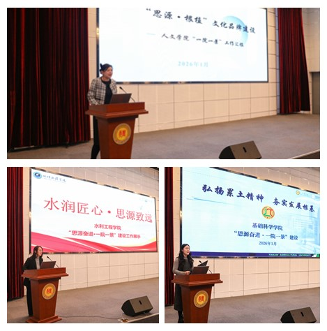 人文学院分享了“思源·根植”文化的内涵,全体师生既要像树木一样,将根系深植于五千年中华文明的丰厚土壤,汲取智慧与力量;又要将知识的枝叶、技能的果实,繁茂地生长在服务乡村振兴、弘扬农耕文明的广阔田野上。水利工程学院展示了“思源·水”文化,将水文化融入思想教育、教学实践、校企协同与社会服务全过程,构建 “知水、爱水、护水、兴水” 文化育人体系,彰显了水利人的责任与坚守。基础科学学院以“思源·累土”文化彰显基础科学的魅力与力量,以理性之思,探寻科学真谛,为文化育人注入新的活力;“九层之台,起于累土”,学院在人才培养、学科建设、文化塑造中注重根基积累、久久为功。