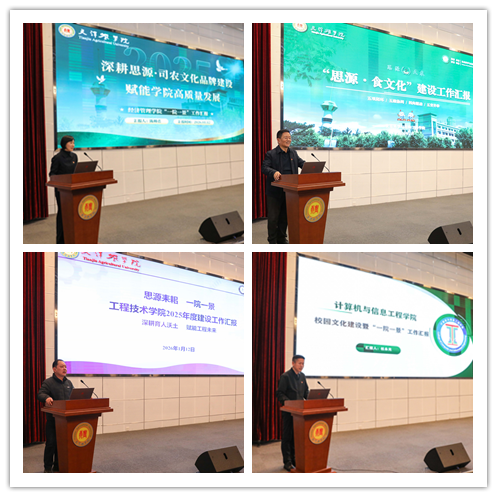 经济管理学院分享“思源·司农”文化,从经管视角解读文化育人,展示了“思源·司农”文化的核心价值,即不忘本源(思源),重视农业(司农),经世济民,强农兴国。食品科学与生物工程学院呈现了以“和谐、卓越、责任、奉献”为内核的“思源·食”文化,构建起“五项闭环、五维协同、四向驱动、五育并举”的建设体系,深度融入党建、教学、科研、实践等各领域。工程技术学院以工科思维赋能文化建设,尽显“思源·耒耜”文化的工科特色与奋进精神,培育以创新为核心的耒耜文化,激发工程学子细致入微、精益求精的品格,打造做人要实、做事要实的“厚道”人格。计算机与信息工程学院以“思源·智农”文化为核心,展现了科技赋能文化的无限可能,以“智”为核心牵引,深度融合科技赋能、人才培育与使命担当,聚焦“智慧赋能农业”的核心理念,延伸“知农育才”的人才导向,彰显“志农兴农”的使命担当。