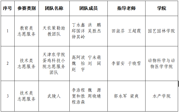 本次大赛以“推崇志愿服务 助力乡村振兴”为主题,志愿服务比赛内容分为3个类别:技术类、管理类、教育类,现场决赛由志愿服务知识测试、志愿服务工作展示、志愿服务案例分析3个环节组成,考察涉农专业研究生志愿服务知识水平、解决实际问题的综合能力。我校园艺园林学院“天农策勒助教团队”团队、动物科学与动物医学学院“威客电竞蛋鸡科技小院志愿服务” 团队、水产学院“武陵人”团队在决赛中均荣获三等奖。