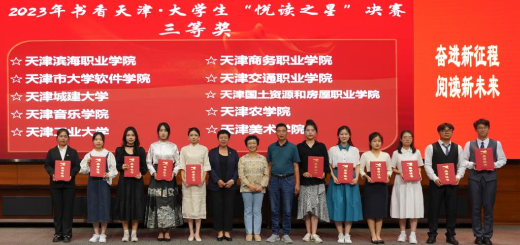 9月27日,由天津市全民阅读活动办公室,天津市高等学校图书情报工作委员会,天津市高等教育文献信息中心主办,天津中德应用技术大学承办的“奋进新征程,阅读新未来”2023书香天津·校园大学生“悦读之星”评选活动总决赛在天津中德应用技术大学举办,共有来自全市本科院校、军事院校、独立院校和高职高专51所学校的51位选手入围决赛。我校人文学院庄萌萌同学荣获大赛三等奖,经济管理学院魏星美、园艺园林学院李梓毓、食品科学与生物工程学院武子艳三位同学获得了天津市悦读之星网络人气奖。