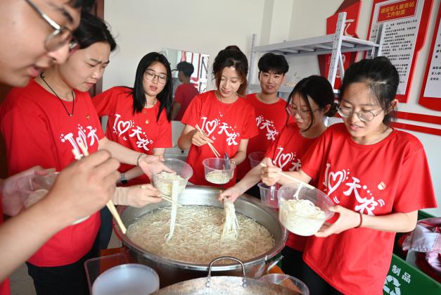 我校师生先后走进运河博物馆、吕官屯村艺术陈列馆、耕读之家实地探访,蜿蜒的运河、传统农具和农家生活场景一一展现在师生面前,大家深切感受到了耕读文化的魅力。在金句展厅,一幅幅宣传贯彻党的二十大精神书法作品盎然铺展,村民们把对党的感激,涌动于心坎、洋溢于笔尖、展现于言语。随后,我校师生与吕官屯村包村干部、党员、村民代表、网格员、志愿者,一起为吕官屯村的老人们煮喜面并冒着酷暑逐一送到村民家中,以共同吃喜面的方式庆祝中国共产党成立102周年。