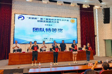 经过一天的激烈角逐,4支队伍获团队奖特等奖、10支队伍获团队一等奖、21支队伍获团队二等奖,来自13所高校的16支队伍晋级决赛。大赛评出19名优秀指导教师,11家单位获优秀组织奖,5名教师获金牌裁判奖。总裁判长唐小千教授对大赛进行了总结点评。天津现代天骄水产饲料股份有限公司董事长孙超、人力总监原雪峰,北京欧倍尔软件技术开发有限公司销售总监张志山、经理田海林,大赛总裁判长唐小千,水产学院党委书记彭增甫、院长郭永军为获奖师生颁奖。