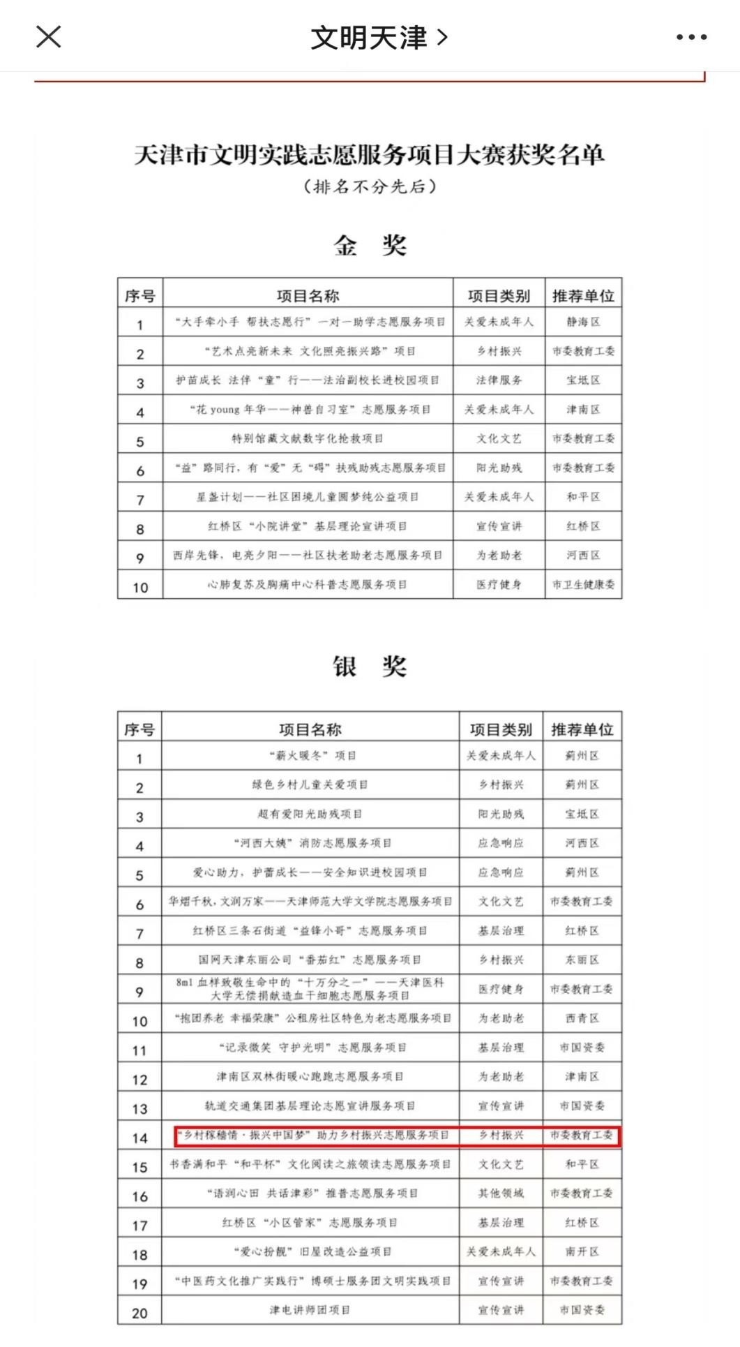 我校“乡村稼穑情·振兴中国梦”助力乡村振兴志愿服务项目荣获天津市文明实践志愿服务项目大赛银奖