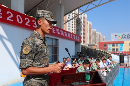 承训部队教官代表杨鹏超发言,他希冀同学们要把在军训中养成的好思想、好作风、好习惯带到学习生活中去,做到军训一日,受益终身。