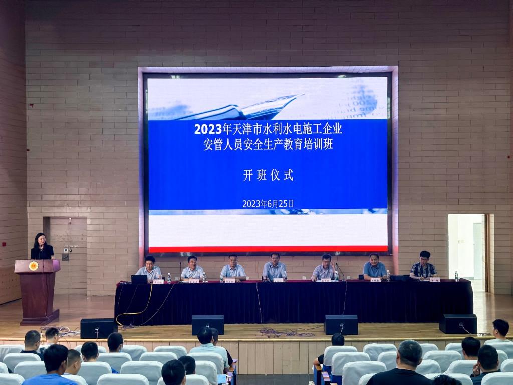 2023年天津市水利水电施工企业安管人员安全生产教育培训班在我校举办。本次培训班由全市39家水利施工企业的主要负责人、项目负责人和专职安全生产管理人员共975人参加。开班仪式于6月25日举行,校党委常委、副校长王繁珍,天津市水务局安全监督处副处长许光禄出席仪式。