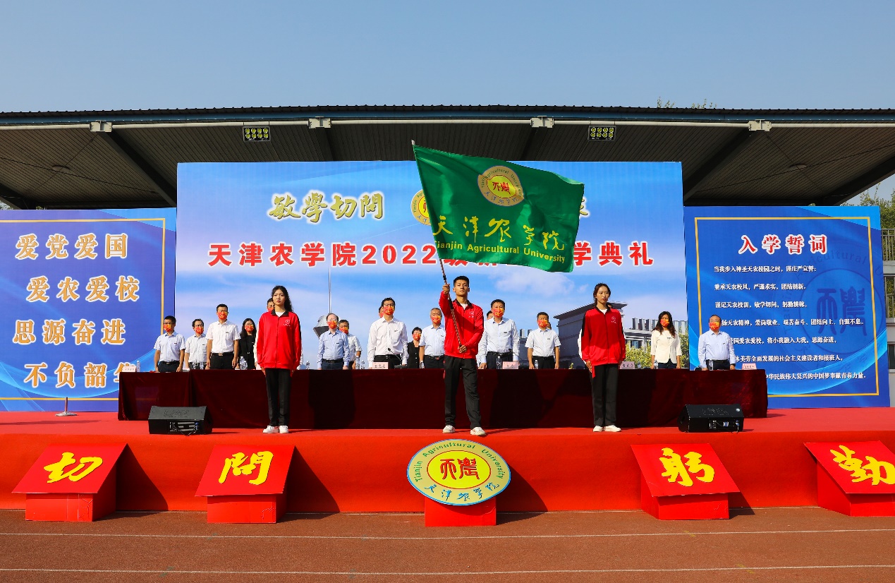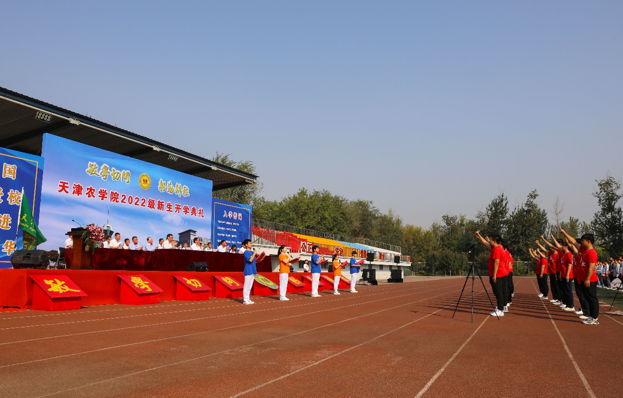 2022级水产专业硕士研究生李浩程同学带领全体新生入学宣誓,誓以成为天农人而自豪,爱党爱国爱农爱校,将小我融入大我,思源奋进,做德智体美劳全面发展的社会主义建设者和接班人,为乡村振兴,实现中华民族伟大复兴的中国梦奉献青春力量。
