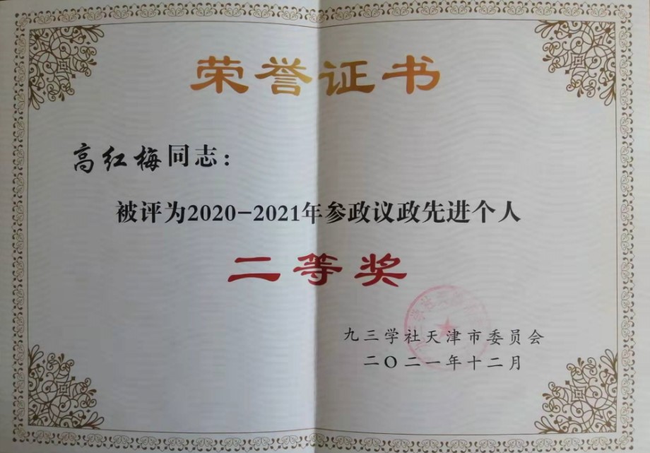 近日,九三学社天津市委员会表彰了2020-2021年度参政议政工作先进集体和先进个人,我校九三学社支社主委高红梅教授荣获先进个人称号,其提交的咨政成果《京津冀农业文化遗产协同保护与发展的建议——以天津“小站稻”种植系统为例》获2021年度参政议政优秀成果二等奖。