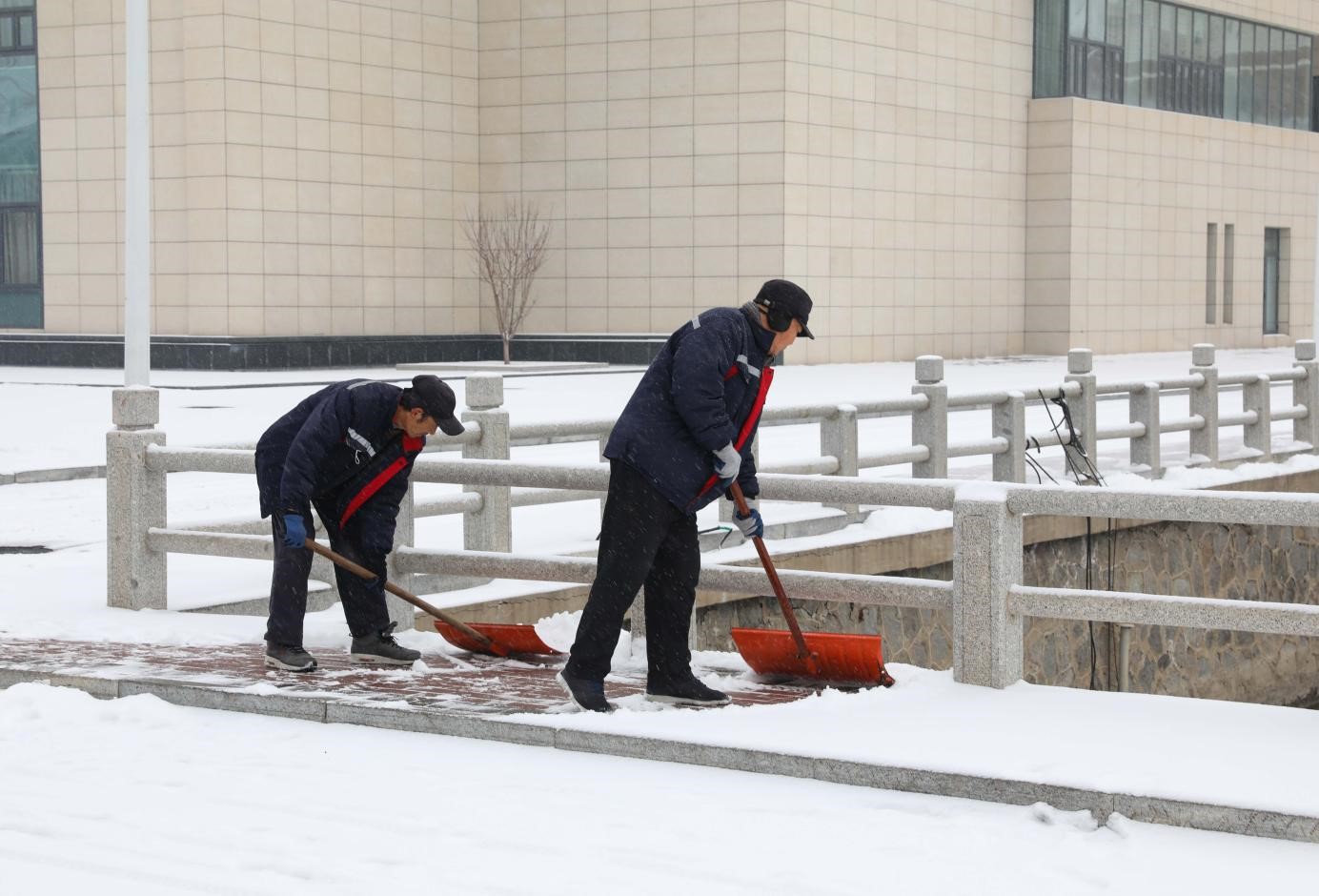 天农师生在校园里清理积雪