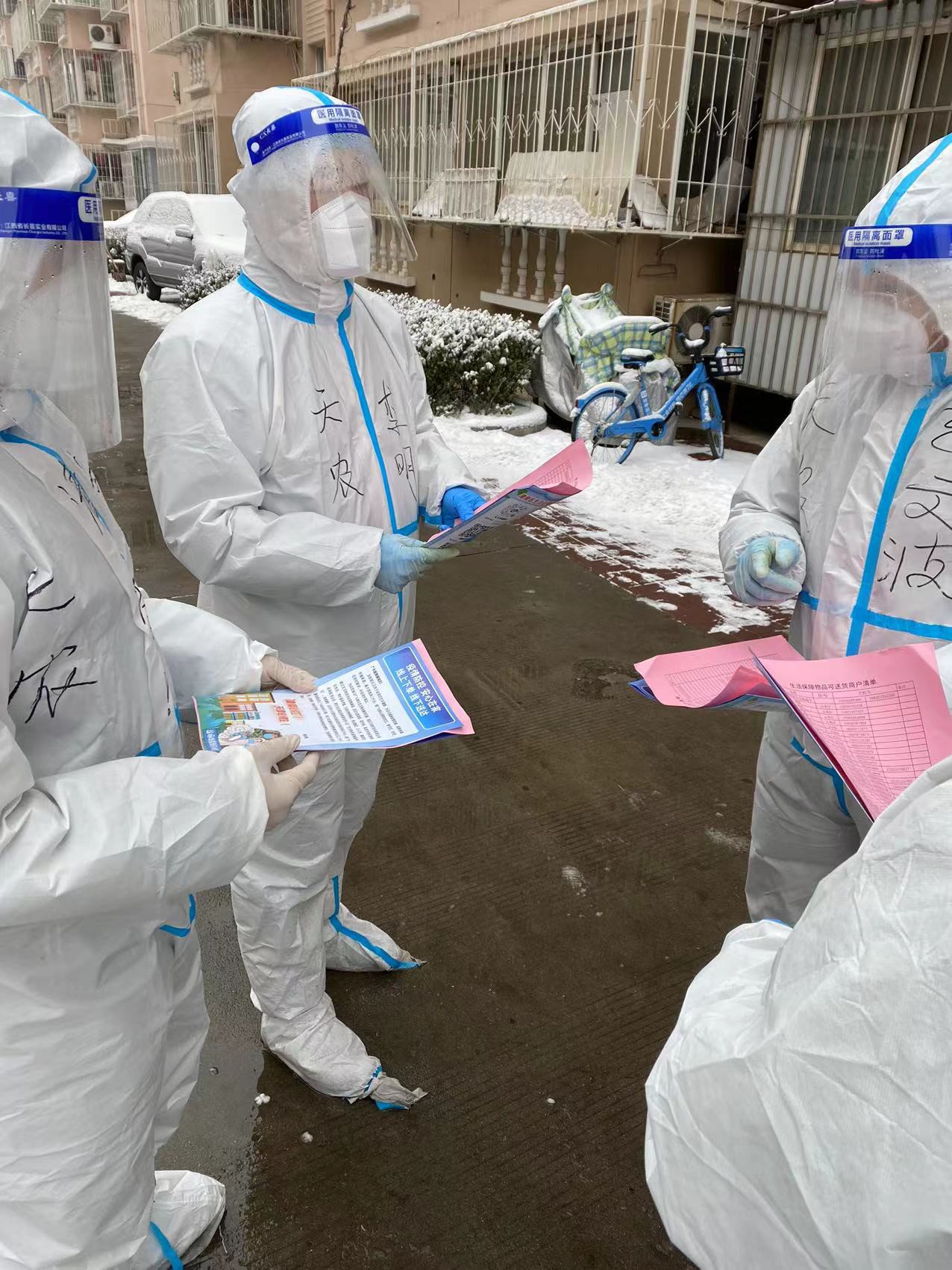 责任区楼栋单元内的物资配送和生活垃圾清运是工作队每日的重要任务,也是最易出现接触传播风险的环节。全体队员时刻严把封控区内工作标准,严格做到物资“非接触式”配送和垃圾清运“前、中、后”全程跟踪消杀,以最严尺度、最高标准最大限度压缩传播风险存在空间。