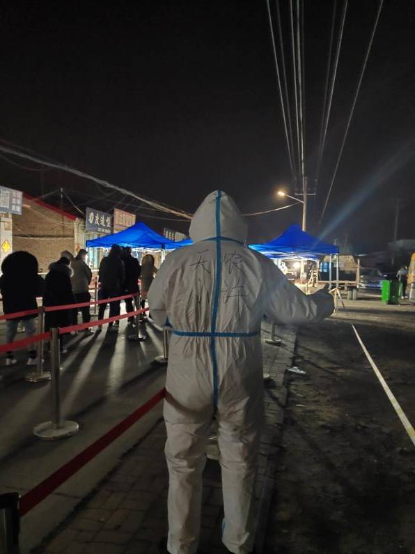 1月8日清晨,他主动找到村委领导,请战疫情防控。仅在几个小时后,他就全副武装的站在疫情防控志愿者的队伍当中开始工作。8日晚,正营村连夜开展核酸筛查,为维护筛查秩序,他一夜步行三十余里路,不叫苦、不喊累,坚守岗位彻夜未退,直至第二天中午才轮换休息。清晨到达,凌晨下岗,是他每天的日常,防护服里裹着迷彩绿,彻骨寒冬不挡为民情。