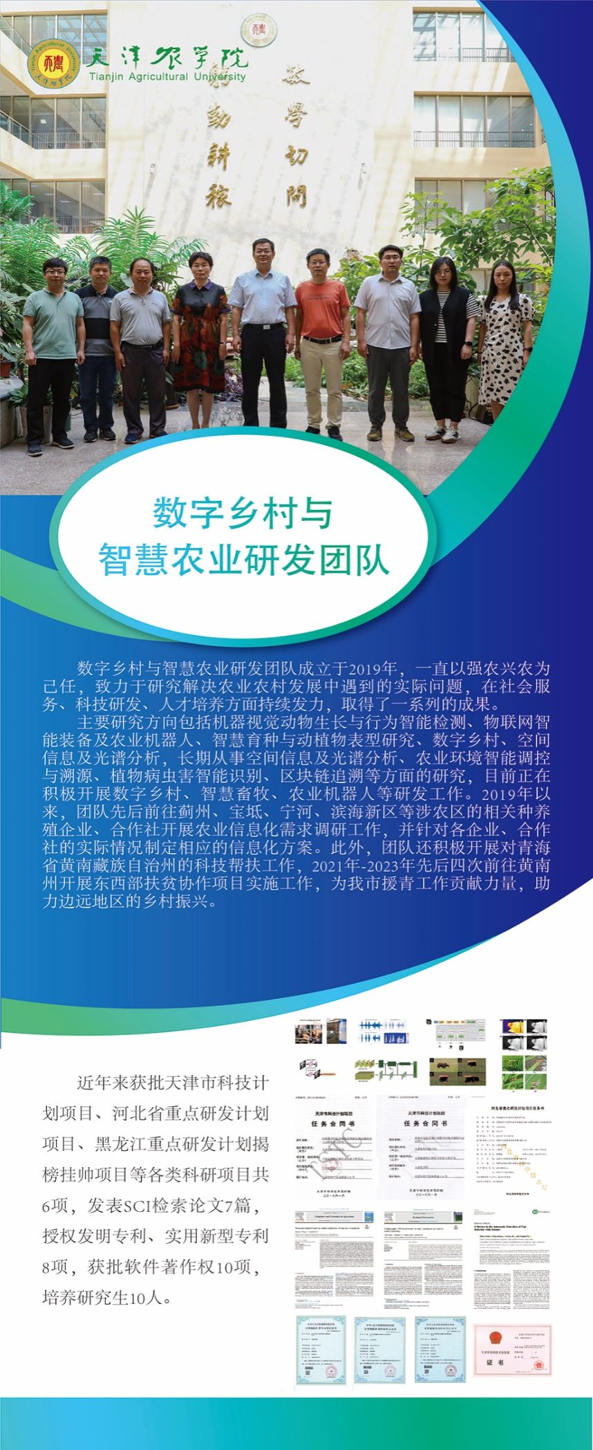 该团队是由我校党委常委、副校长王繁珍教授作为学科带头人组建的跨学科研发团队,团队全面贯彻落实乡村振兴战略,发挥“智慧农业”产学研优势,以产业振兴、生态振兴、人才振兴为抓手,助力乡村经济社会发展和美丽乡村建设。团队针对天津市、河北省、甘肃省、青海省的农牧业发展需求,以科技赋能攻克技术难题,为当地农牧业的现代化和高质量发展做出了卓有成效的努力和贡献。