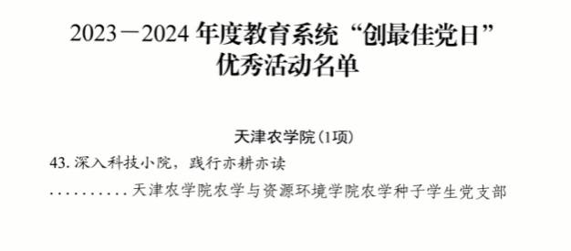 近日,市委教育工委、市教委公布了2023-2024年度教育系统“创最佳党日”优秀活动名单,我校推荐的农学与资源环境学院农学种子学生党支部“深入科技小院,践行亦耕亦读”党日活动获评2023-2024年度教育系统“创最佳党日”优秀活动。