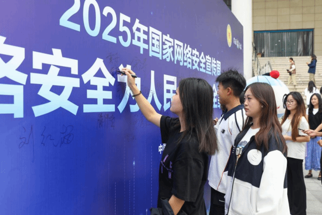 活动现场,师生代表在主题背板前郑重签下姓名,寓意共同维护清朗网络空间。