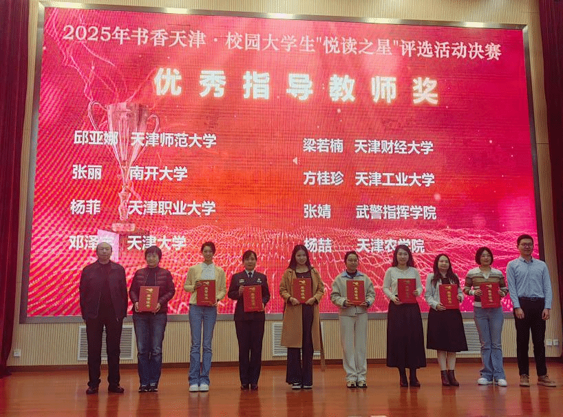 10月23日,“品读优秀经典·赓续津沽文脉”——2025年书香天津·校园大学生“悦读之星”评选活动决赛在天津师范大学会议中心大报告厅举行。我校人文学院2023级文化产业管理专业学生王紫琦获大赛一等奖,图书馆流通部馆员杨喆获评“优秀指导教师奖”,校图书馆荣获“优秀组织奖”。
