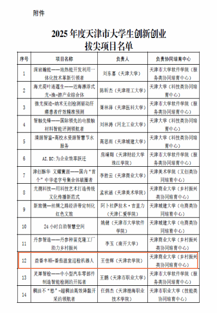近日,由我校工程技术学院宋欣教授指导,机器人工程专业2023级本科生王佳辉、赵嘉辉等同学完成的《益番丰顺-番茄温室巡检机器人》项目,在与全市多所高校的激烈角逐中脱颖而出,入选2025年度天津市大学生创新创业拔尖项目,实现了我校在该项目中零的突破。