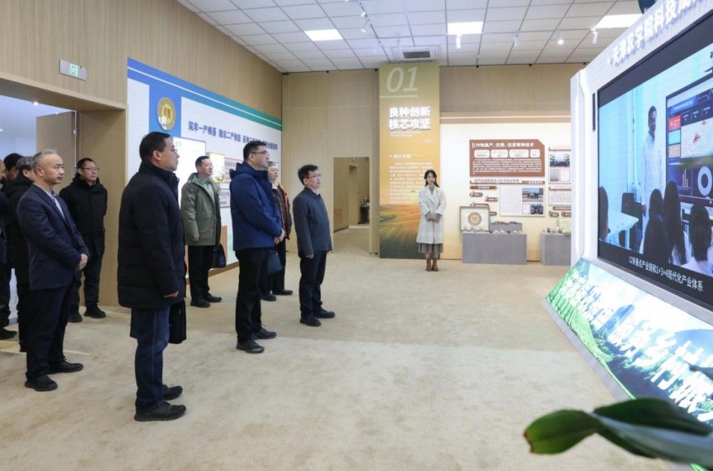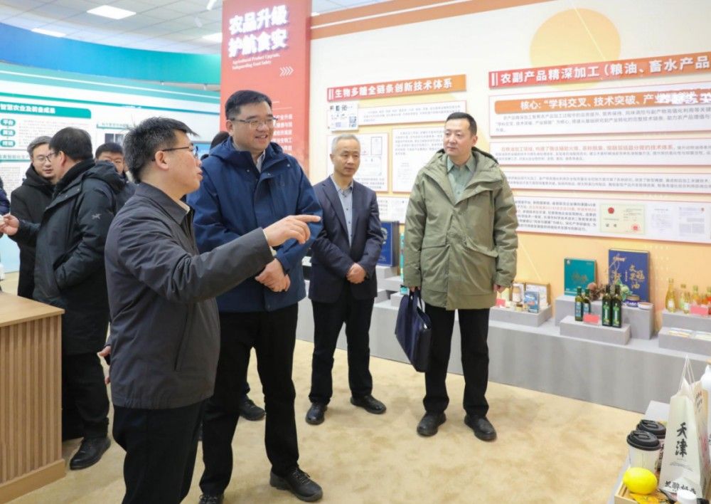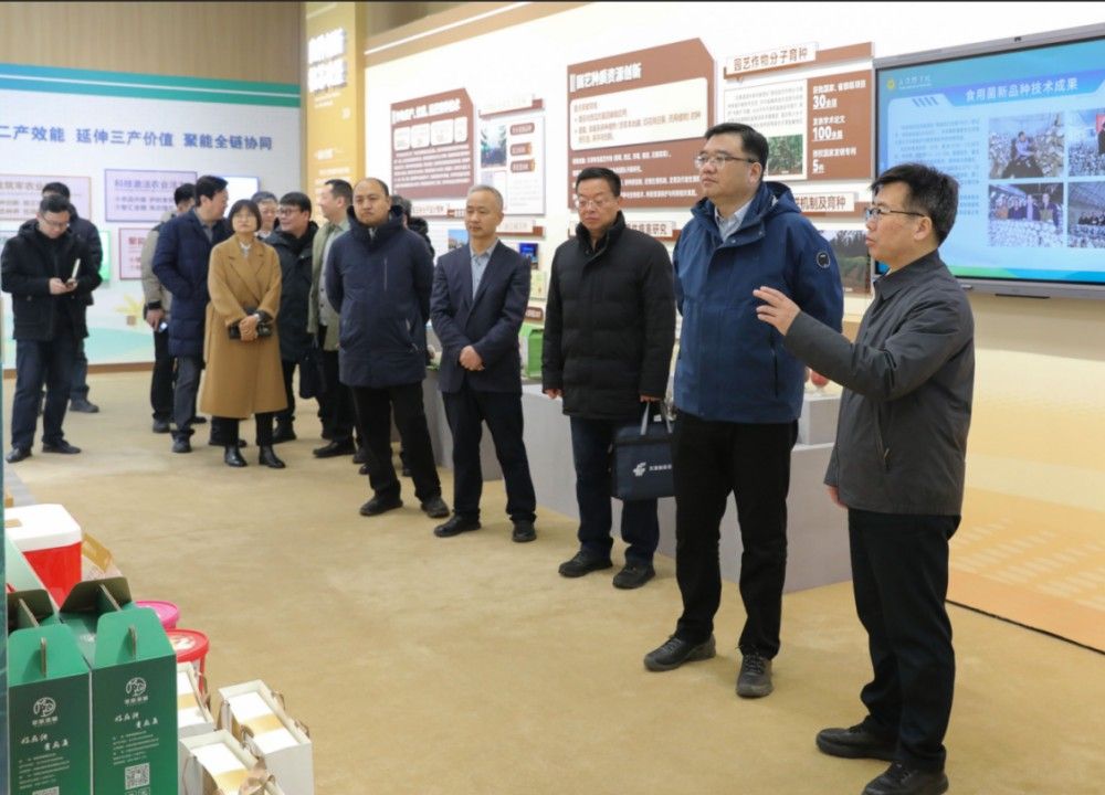 在科技成果展厅,李鑫代表学校对刘俊一行的到来表示热烈欢迎,并陪同参观了农业科技成果展。展厅内,讲解员详细介绍了我校建校50年来聚焦农业发展获得的科技成果奖励和现阶段服务农业产业升级取得的创新实践成就。健康食品开发、特色水产养殖、智慧种养技术等新成果给来宾留下了深刻印象。参观中,双方就冷链运输、网络直播、网销农产品等话题展开了深入交流。