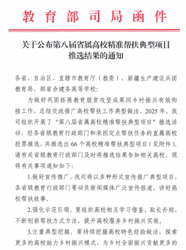 近日,教育部公布“第八届省属高校精准帮扶典型项目”评选结果,我校报送的《一粒种子激活西部农业之“芯”—威客电竞科技支援西部地区农业发展的实践模式》成功入选。此次教育部共推选高校精准帮扶典型项目66个,其中我市3个项目入选。