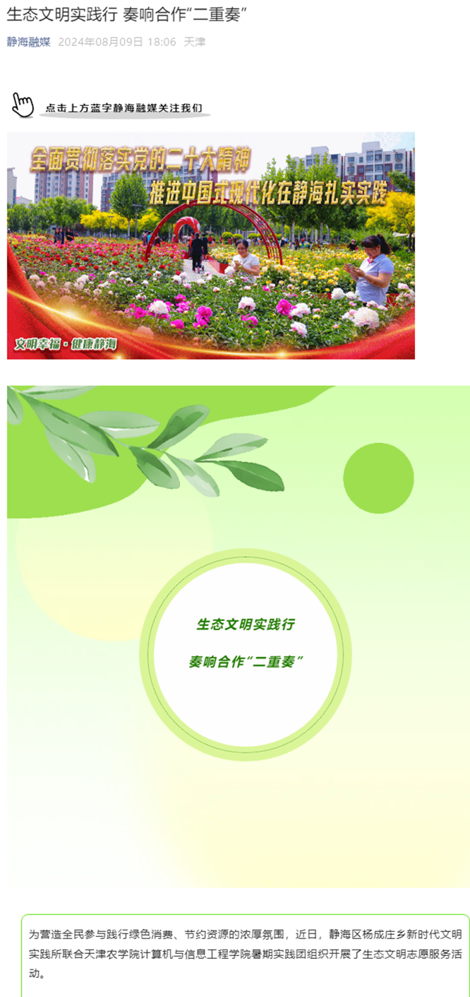 2024年8月9日,静海融媒公众号报道静海区杨成庄乡新时代文明实践所联合我校计算机与信息工程学院暑期实践团组织开展了生态文明志愿服务活动。