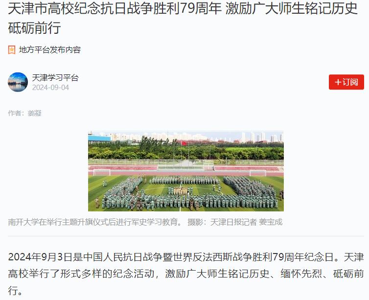 2024年9月4日-6日,学习强国平台-天津学习平台、津门教育公众号、《天津教育报》等多家媒体报道我校举办活动纪念抗日战争胜利79周年。