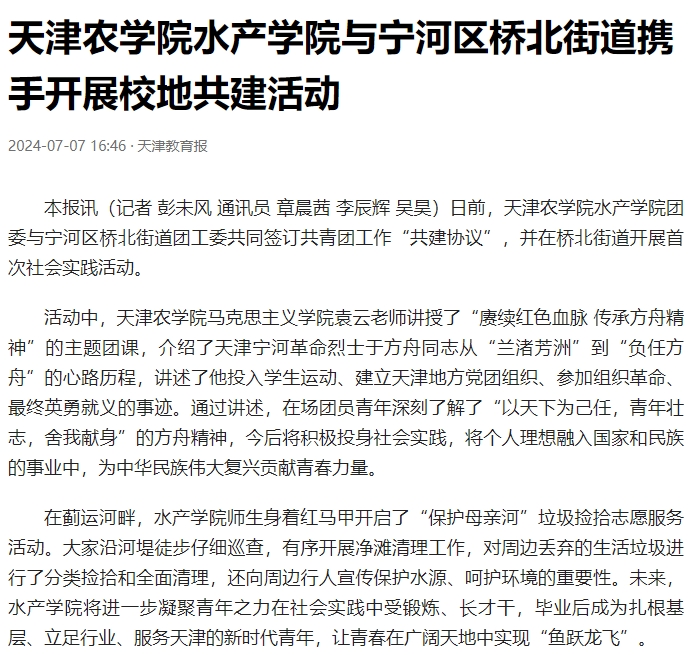 2024年7月7日,今日头条-天津教育报报道我校水产学院团委与宁河区桥北街道团工委共同签订共青团工作“共建协议”,并在桥北街道开展首次社会实践活动。