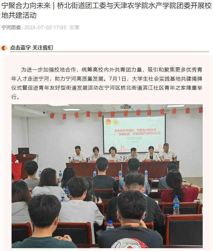 2024年7月2日,宁河团委公众号报道水产学院与宁河区桥北街道开展校地共建活动。水产学院与宁河区桥北街道团工委共同签订了共青团工作“共建协议”,并在桥北街道开展了第一次社会实践活动,共同庆祝中国共产党成立103周年。