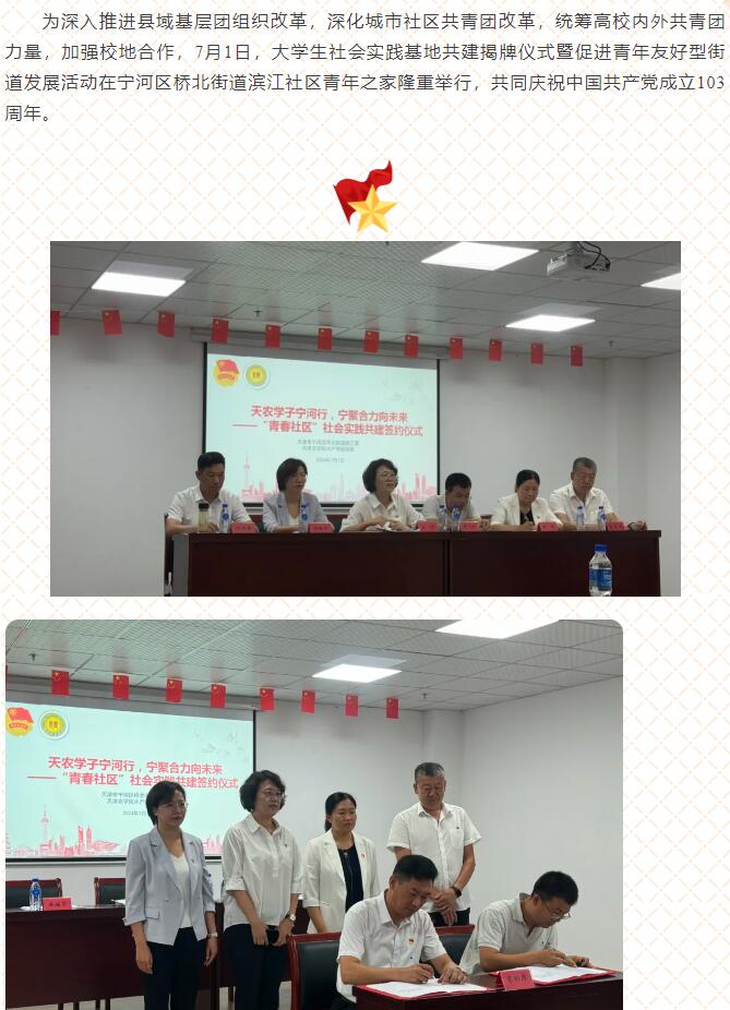2024年7月2日,宁河融媒报道水产学院与宁河区桥北街道开展校地共建活动。水产学院与宁河区桥北街道团工委共同签订了共青团工作“共建协议”,并在桥北街道开展了第一次社会实践活动,共同庆祝中国共产党成立103周年。
