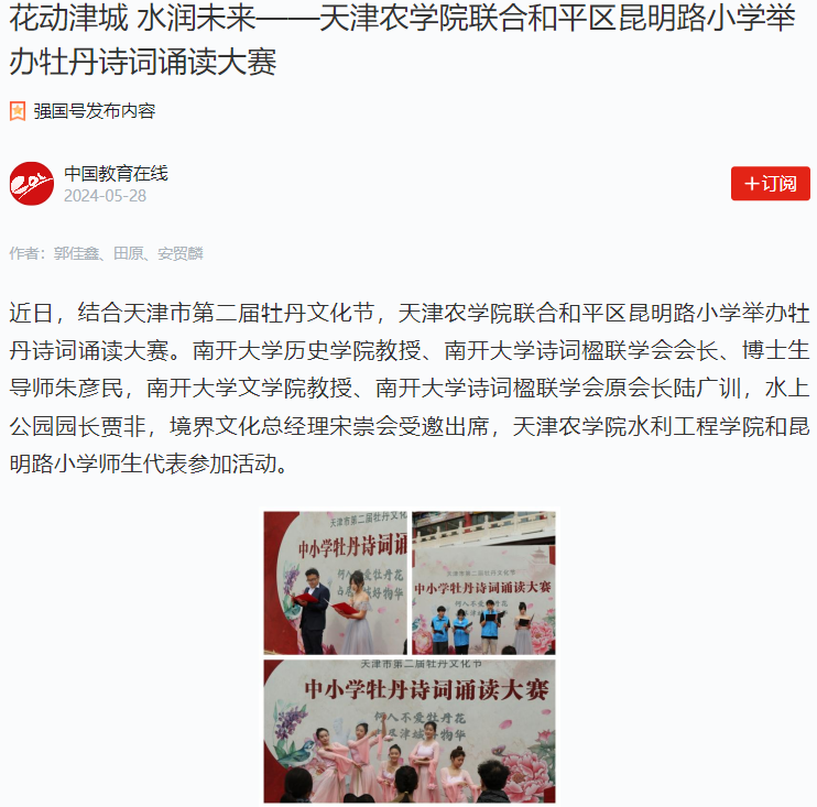2024年5月28日,学习强国平台-中国教育在线报道,结合天津市第二届牡丹文化节,我校联合和平区昆明路小学举办牡丹诗词诵读大赛。南开大学历史学院教授、南开大学诗词楹联学会会长、博士生导师朱彦民,南开大学文学院教授、南开大学诗词楹联学会原会长陆广训,水上公园园长贾非,境界文化总经理宋崇会受邀出席,我校水利工程学院和昆明路小学师生代表参加活动。