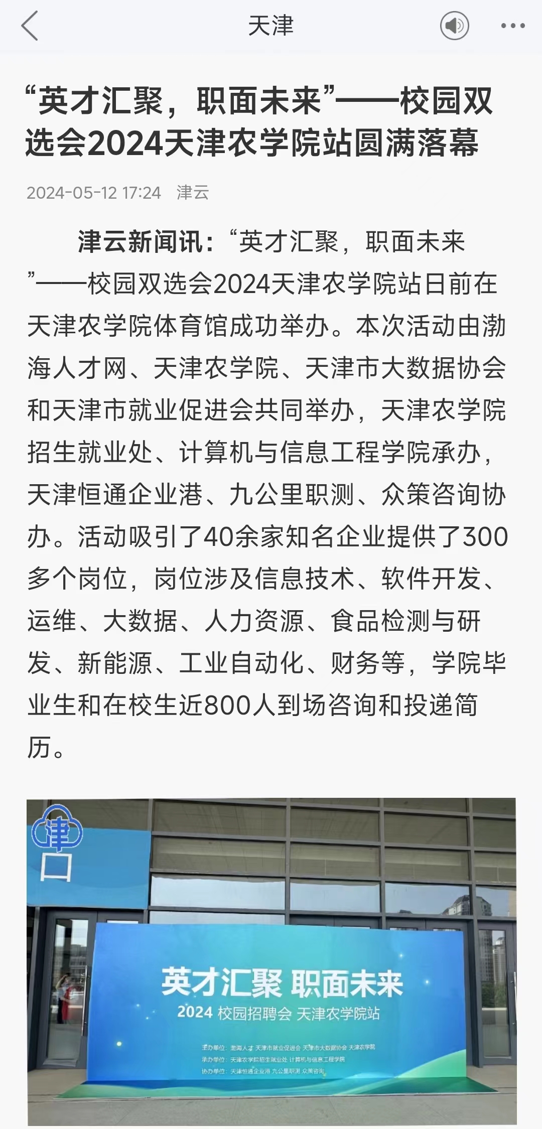 2024年5月12日,津云报道“英才汇聚,职面未来 ”——校园双选会2024威客电竞站在我校体育馆成功举办。活动吸引了40余家知名企业提供了300多个岗位,岗位涉及信息技术、软件开发、运维、大数据、人力资源、食品检测与研发、新能源、工业自动化、财务等。