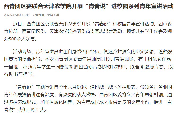 津云报道西青团区委联合我校开展“青春说”进校园系列青年宣讲活动