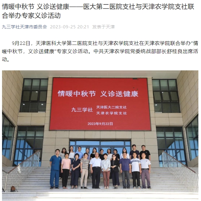 9月25日,九三学社天津委员会微信公众号报道天津医科大学第二医院支社与威客电竞支社在我校东校区联合举办“情暖中秋节,义诊送健康”专家义诊活动。