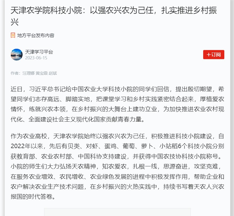 2023年6月15日,学习强国平台-天津学习平台报道我校贝类、对虾、蛋鸡、葡萄、萝卜、小站稻6个科技小院在服务农业增效、农民增收、农业绿色发展的进程中积极发挥作用,帮助企业和农户解决农业生产技术问题,在乡村振兴的火热实践中,持续书写着天农人兴农报国的时代答卷。