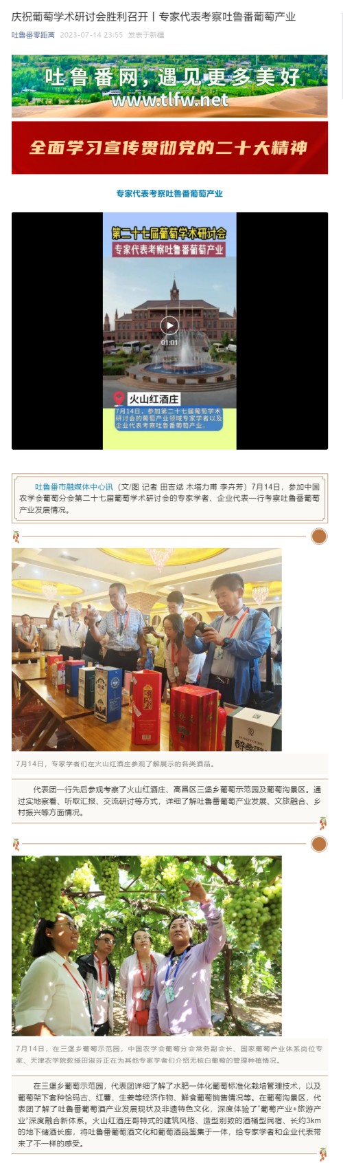 2023年7月14日,吐鲁番零距离微信公众号以《庆祝葡萄学术研讨会胜利召开丨专家代表考察吐鲁番葡萄产业》为题,报道我校葡萄科研团队考察吐鲁番葡萄产业。