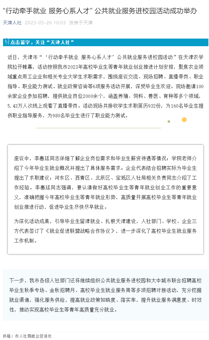 2023年5月26日,天津人社微信公众号报道天津市“‘行动牵手就业 服务心系人才’公共就业服务进校园活动”在我校成功举办。