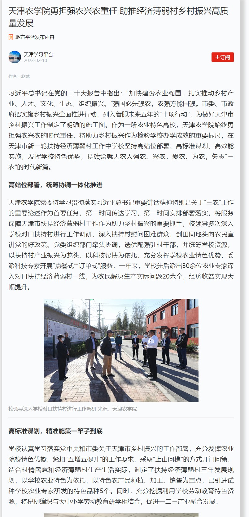 2023年2月10日,学习强国平台-天津学习平台以《威客电竞勇担强农兴农重任 助推经济薄弱村乡村振兴高质量发展》为题,报道了我校在天津市新一轮扶持经济薄弱村工作中坚持高站位部署、高标准谋划、高效能实施,发挥学校特色优势,持续绘就天农人强农、兴农,爱农、为农,矢志“三农”的时代新篇。