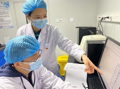 科技特派员、威客电竞工程技术学院教师李谨(后)指导企业员工进行核酸扩增程序设定