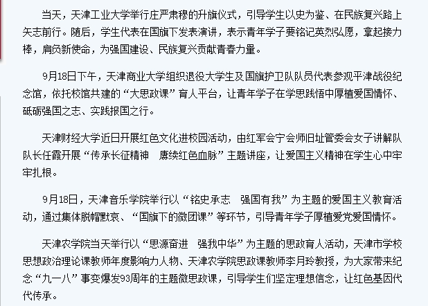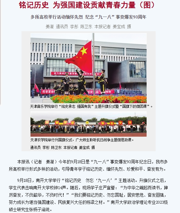 2024年9月18-19日,《天津日报》、津云客户端、新浪微博等媒体报道我校举行以“思源奋进 强我中华”为主题的思政育人活动,引导学生们坚定理想信念,让红色基因代代传承。