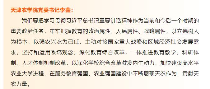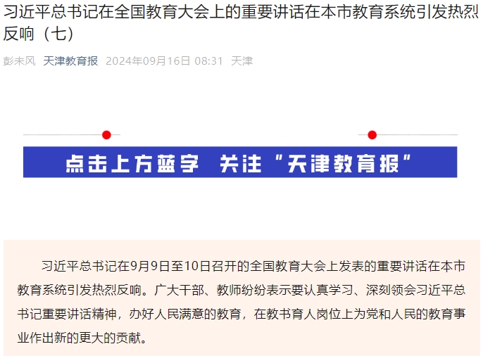 2024年9月16日,天津教育报公众号报道校党委书记李鑫学习领会习近平总书记在全国教育大会上的重要讲话的学习反响。