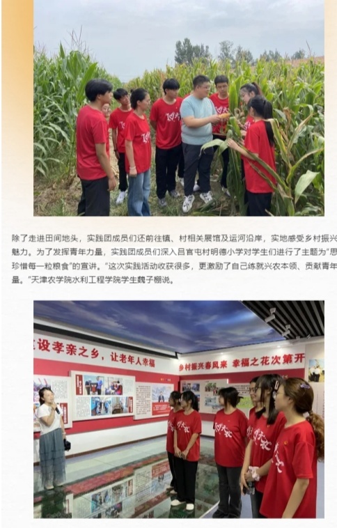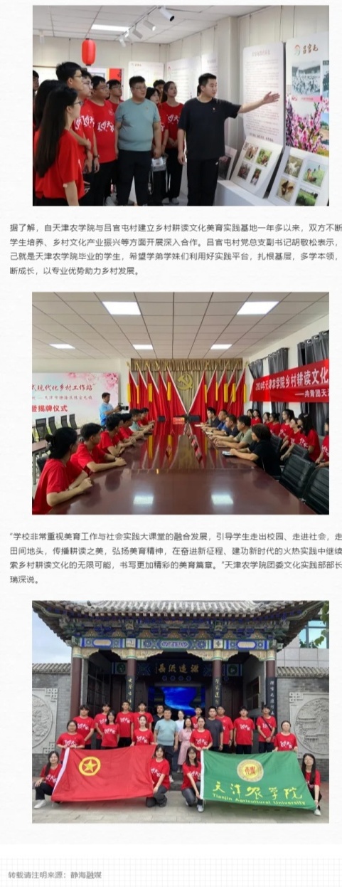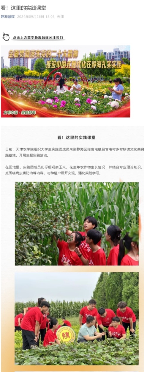 2024年9月26日-27日,静海融媒公众号、学习强国平台报道我校组织大学生实践团成员来到静海区陈官屯镇吕官屯村乡村耕读文化美育实践基地,开展主题实践活动。