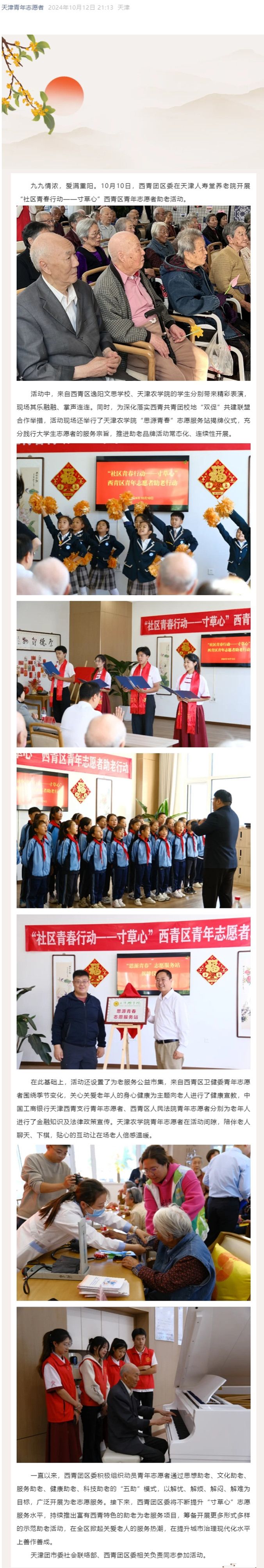 2024年10月12日,天津青年志愿者公众号、学习强国平台、天津西青公众号、西青融媒公众号等多家媒体报道我校师生参与“社区青春行动——寸草心”西青区青年志愿者助老活动。