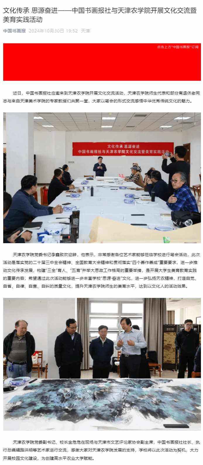 2024年10月30日,中国书画报公众号报道中国书画报社与我校开展文化交流暨美育实践活动。我校师生代表和部分离退休老同志与来自天津美术学院的专家教授们共聚一堂,大家以笔会的形式交流感悟中华优秀传统文化的魅力。