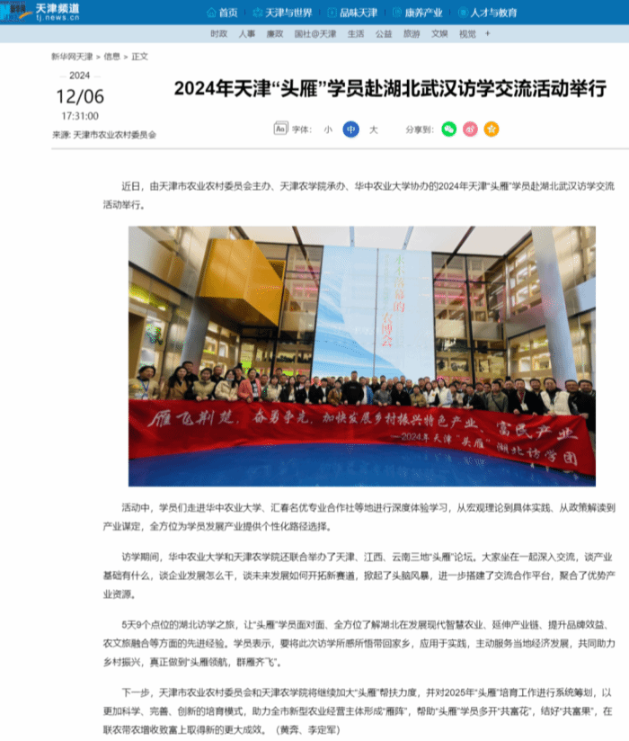2024年12月4日-8日,新华网、中国农网、中宏网、《今晚报》、头雁兴农公众号、津云、津沽三农公众号报道我校承办的天津市2024年乡村产业振兴带头人培育“头雁”项目学员赴湖北武汉开展访学交流,从渤海之滨到千湖之省,开启了一场南飞千里的研学“取经”之旅。